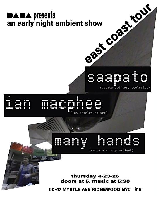 Ambient artists Saapato, Ian MacPhee, and Many Hands will stop at Dada Bar NYC on April 23 for a night on their Northeast tour.